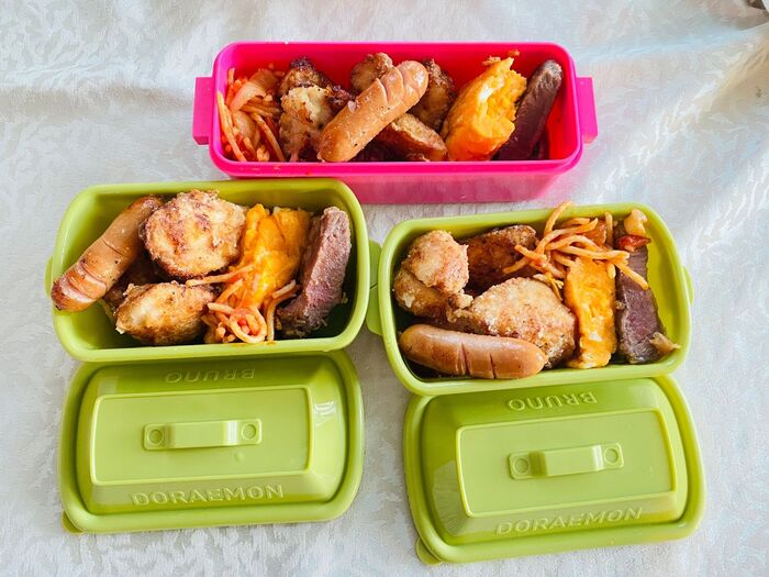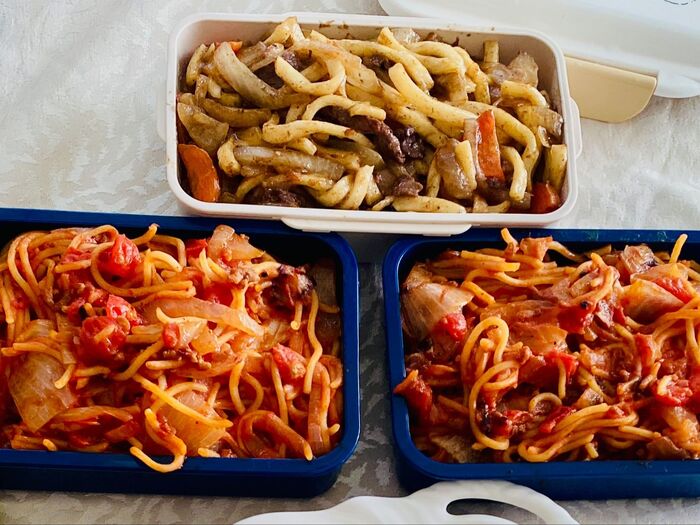 おかず3個分とおにぎり6個を3食分に考え、お肉マシマシ焼きうどん1食分、トマトたっぷりナポリタンが2食分の、合計6食分を用意してみました。