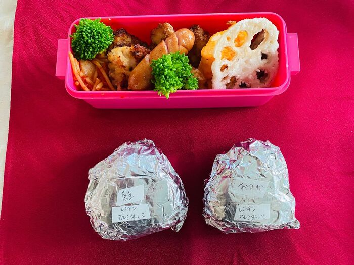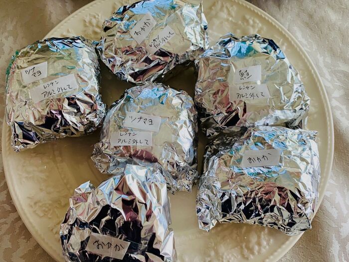 おにぎりは「アルミホイルを外して」シールも貼っておきました。