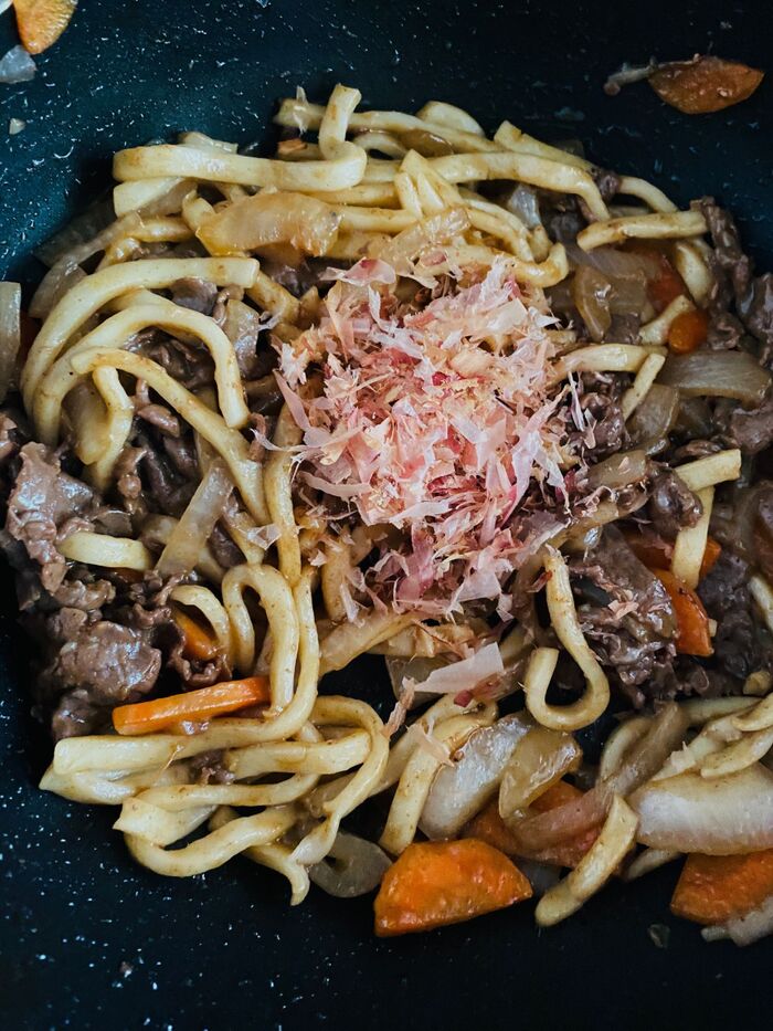 肉マシマシ焼きうどんには、フライパンに油を入れ、牛肉、玉ねぎ、にんじんを炒めて、うどんを入れて炒めます。