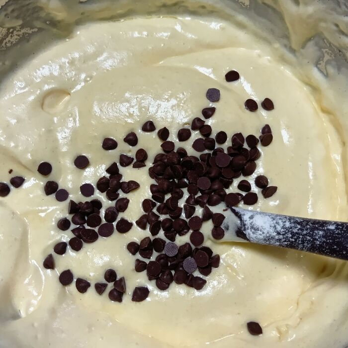 ②薄力粉をふるい入れ、ゴムベラで粉っぽさがなくなるまで混ぜます。次に、バターをゴムベラに伝わせて加え、混ぜ合わせます。最後にチョコチップを加えて混ぜます。