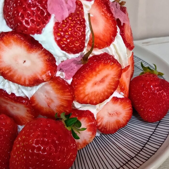 ⑨ホイップクリームの上に苺と桜を貼り付け、スカートの裾部分には丸ごとの苺を飾ります。