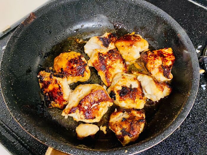①鶏胸肉は一口大の斜め削ぎ切りにして、aの調味料を加え15分以上漬け込みます。