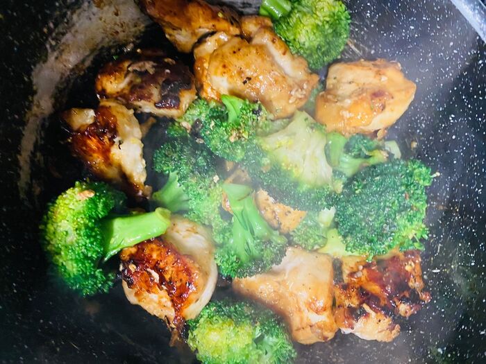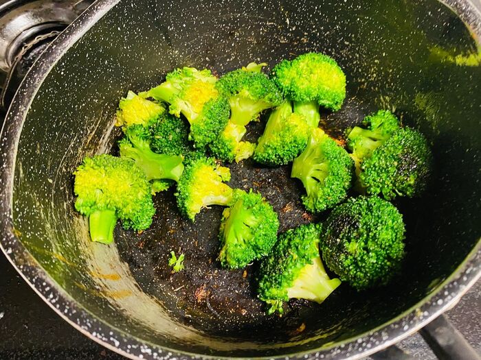②ブロッコリーはよく洗って、よく水気を切ります。鍋に油を入れ、温まりましたら、揚げ焼きします。
