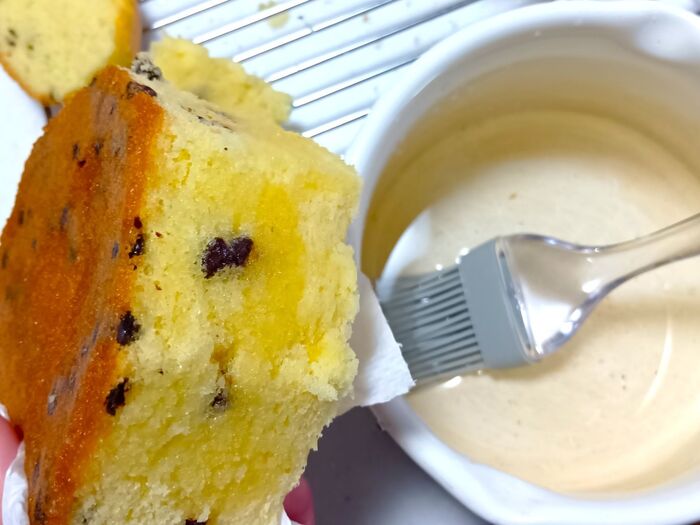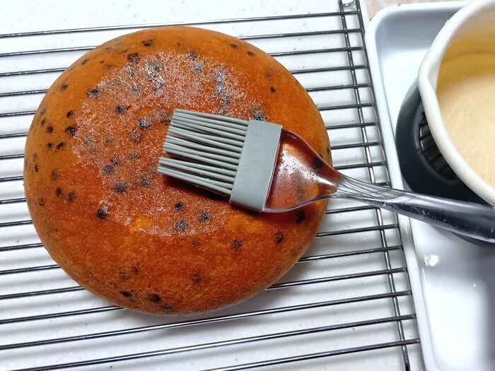 ⑤焼き上がったら内釜からケーキを取り出し、ケーキクーラーの上で冷まします、冷めたら、表面全面にシロップを刷毛で塗ります。