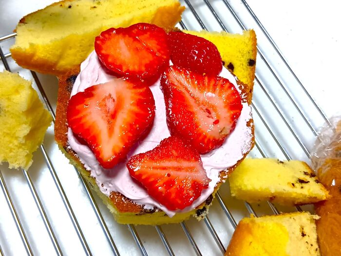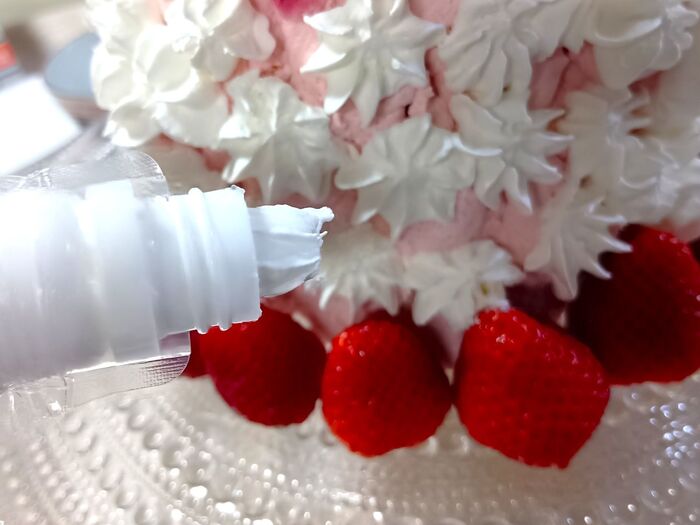 ⑩の上面全面に、ピンク色のホイップクリームを塗り広げ、あまおう苺をのせます。