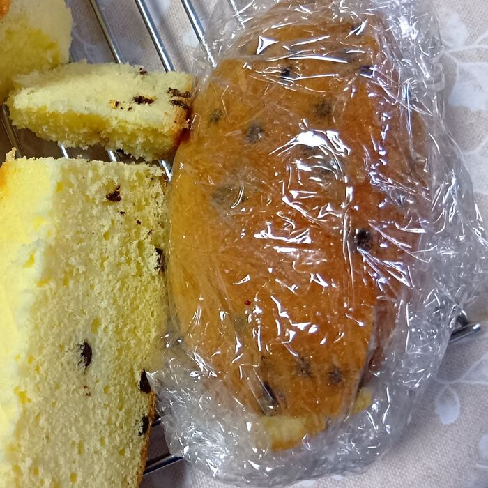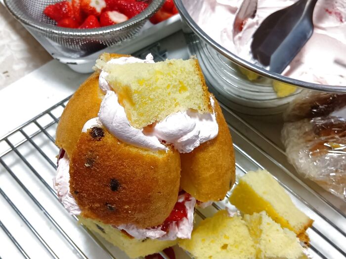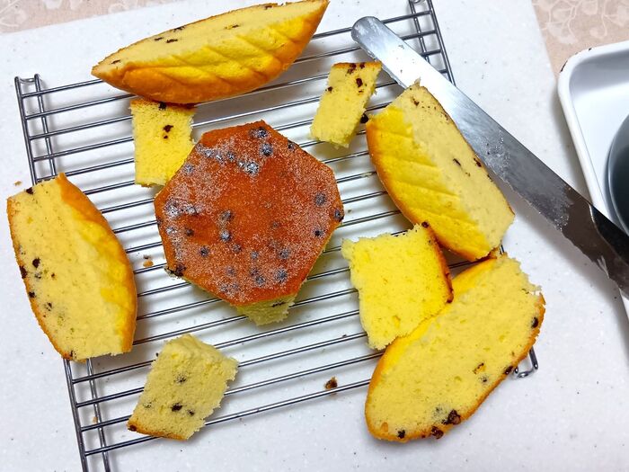 使わない上部分と下部分はラップで包んでおきます。左右にカットした長いスポンジは、さらに横に2等分しておきます。