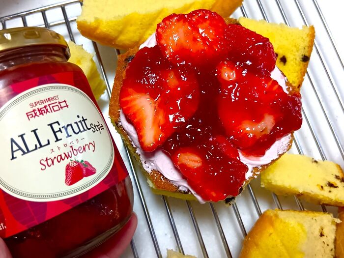 ⑪切り分けた八角形のスポンジの上にストロベリージャムを塗り広げます。その上に、ピンク色のホイップクリームを塗ります。