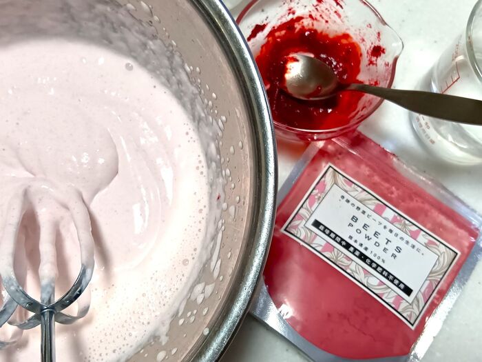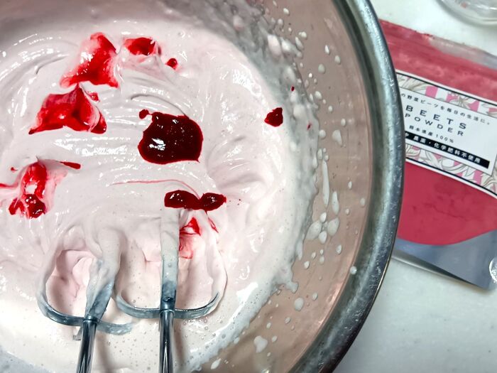 ⑨湯で溶いておいたビーツパウダーも加え、淡いピンク色の7分立てのホイップクリームを作ります。