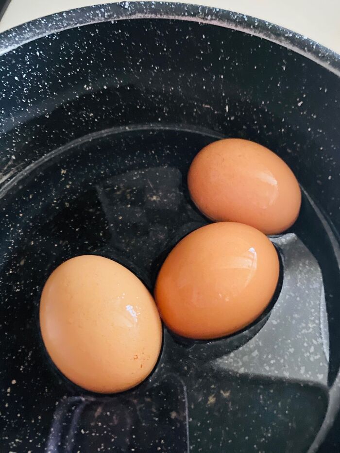 鍋にたっぷりの水、塩を入れ卵を入れ、固茹でにします。