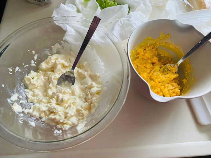 卵白は細く潰して、マヨネーズ、塩胡椒で味付けします。卵黄も細く潰し、明太マヨネーズ、塩胡椒で味付けします。