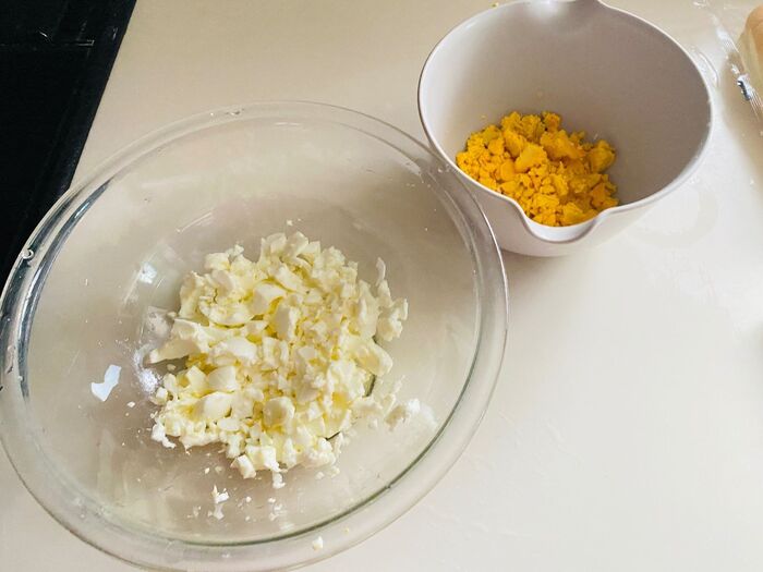 茹で上がったら、皮を剥き、卵白と卵黄に分けます。