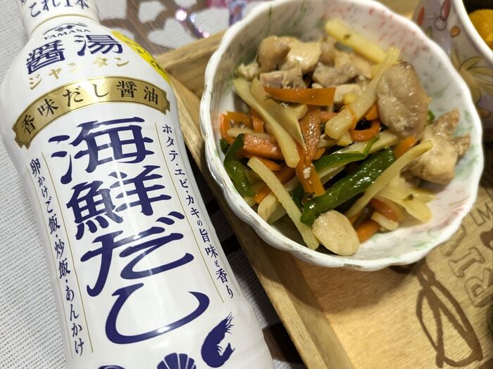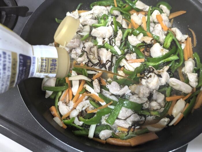 いつもはオイスターソースや醤油を入れて味付けする炒め物にも、海鮮だしだけでパパっと味付け!