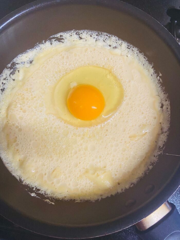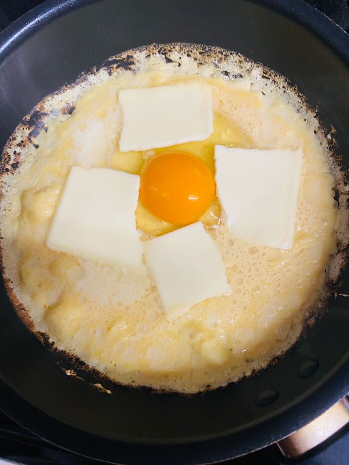 生地の周りが固まってきたら卵を割入れます。