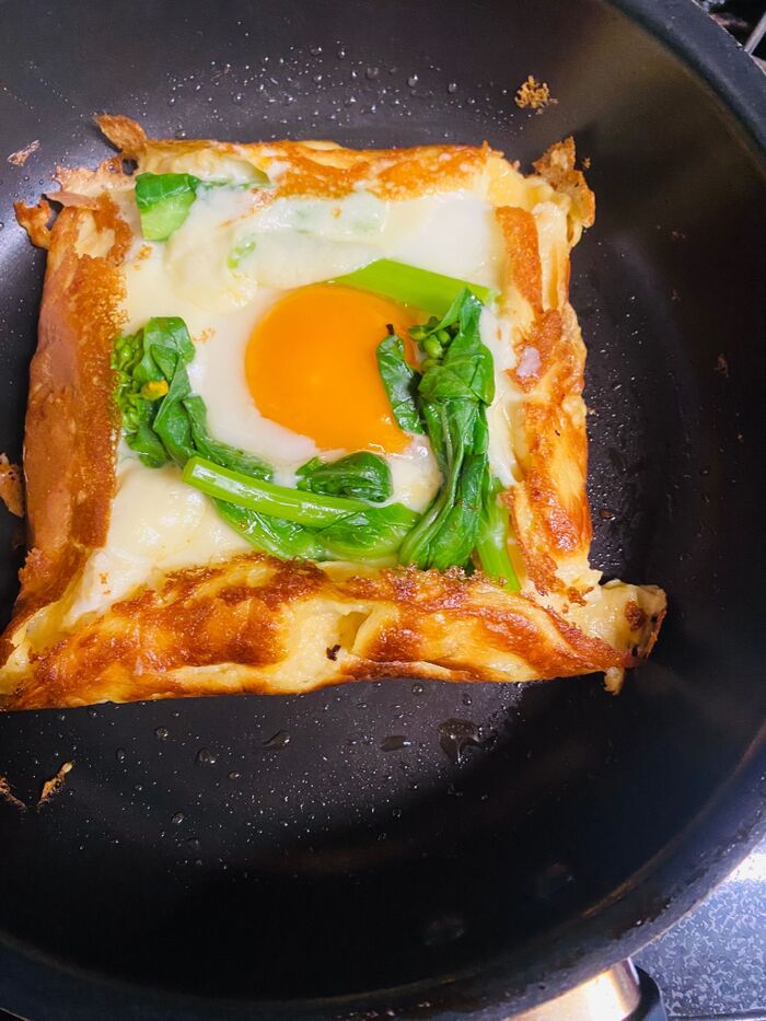 そば粉の入った生地を強火で薄く焼き、ハム、卵、野菜などお好みの具材を入れ、お食事として楽しみますよ。