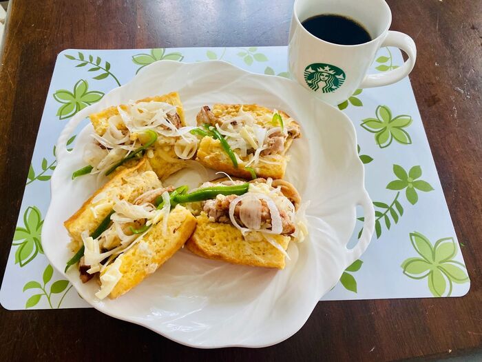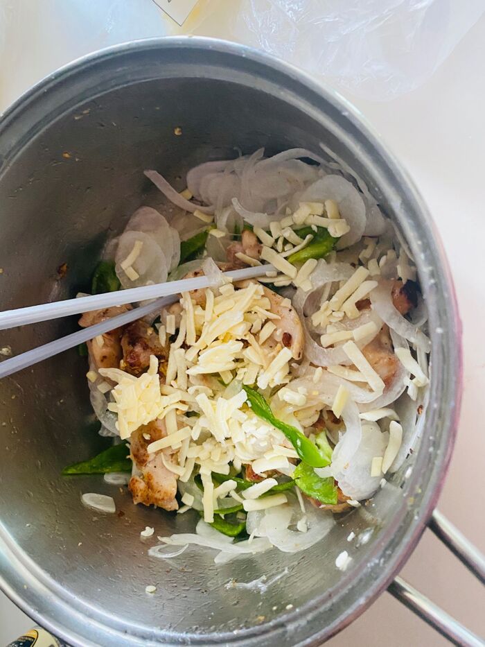 熱いうちに、スライスした玉ねぎ、ピーマン、ピザ用チーズと和えます。