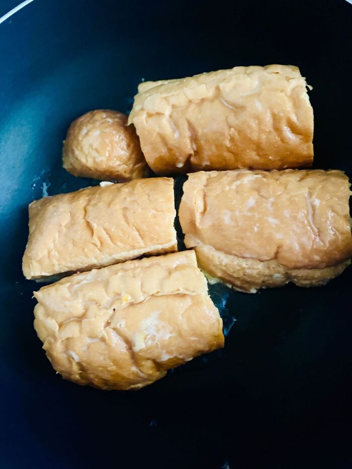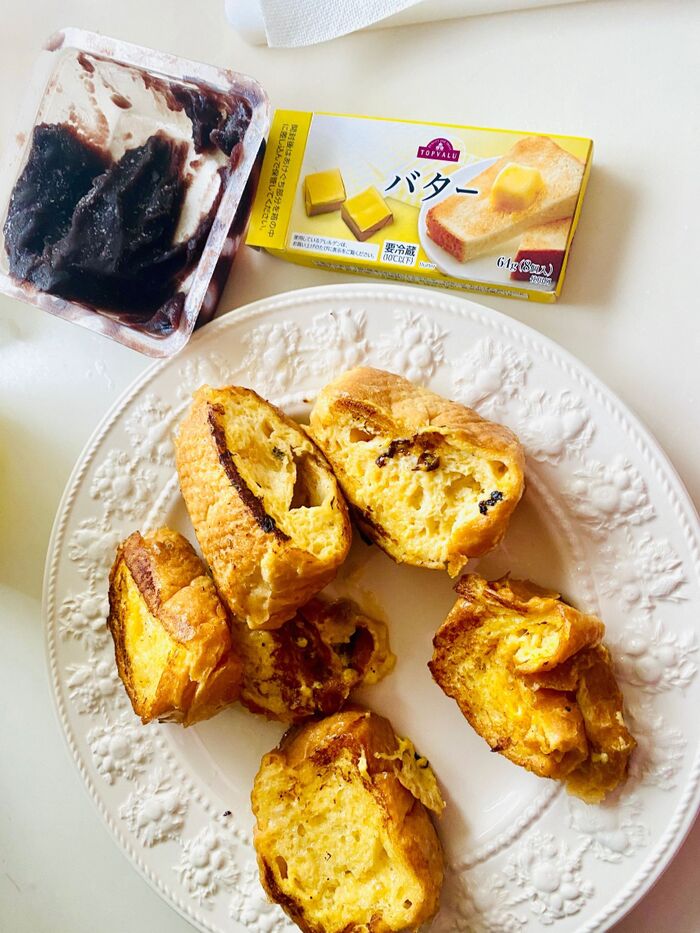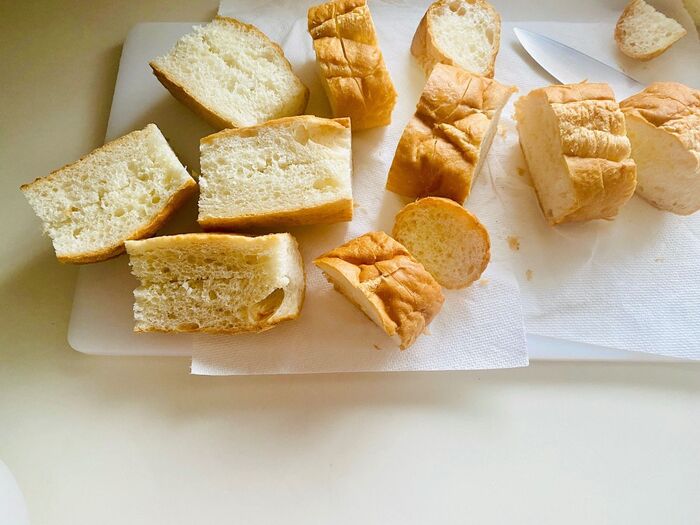 フライパンに、小さじ1の油を入れ、塩味系のフランスパンをやや強火で、カリッと焼きます。
