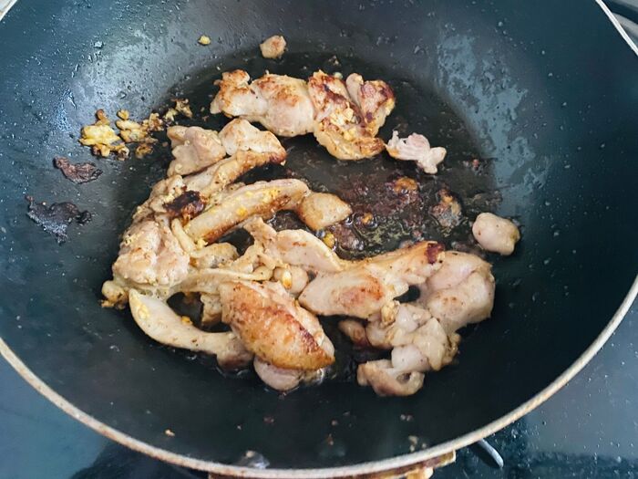 フライパンを温め、ステック状に切った鶏もも肉をよく炒め、ナツメグ、塩胡椒で味付けします。
