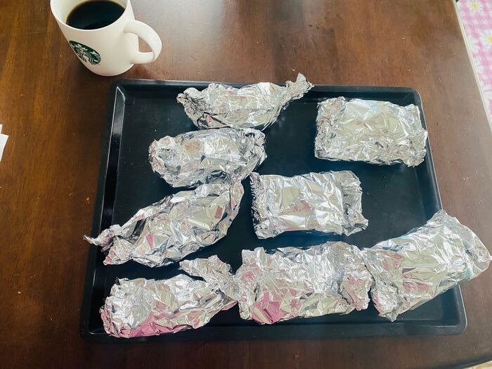 サランラップで包んだ後に、アルミホイルで包み、お花見用お供にもおすすめです。