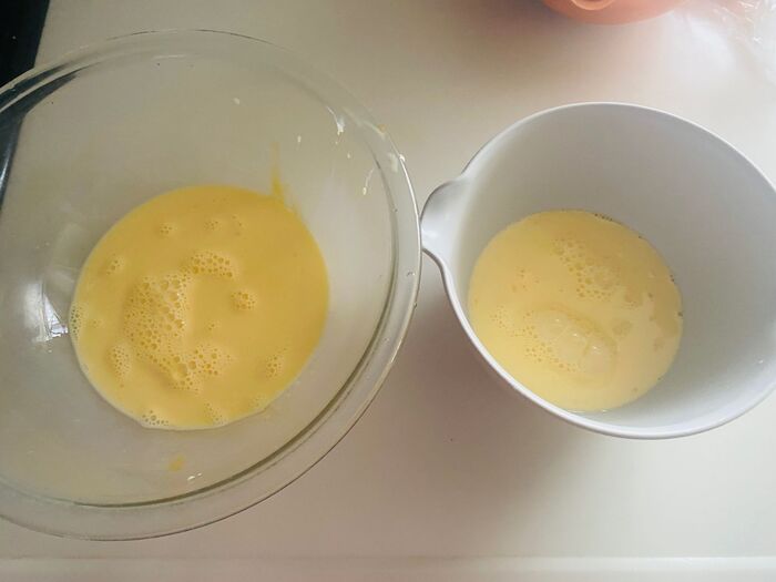 ボウルに卵を割り入れ、牛乳とよく混ぜます。