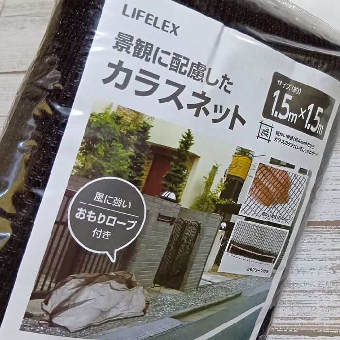2回目のリピ買いになる、お気に入りのコーナンで購入したカラスネットに、この目玉をちょこんと貼り付けてみました。 ちょっと大きな“目”に見えるからか、カラスも「ん?」と警戒してくれるかな?