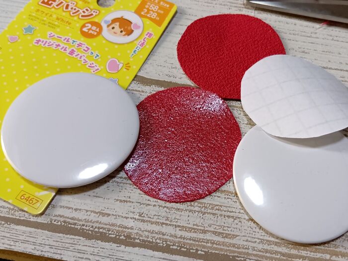 さきほど丸くカットした赤い布風シート2枚を缶バッジ2個にそれぞれ貼り付けます。