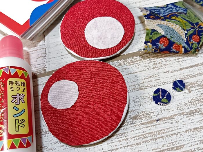 ボンドが塗れたら、赤い布を貼った缶バッジの上に、ミャクミャクの目をイメージして白い布を貼り付けます。
