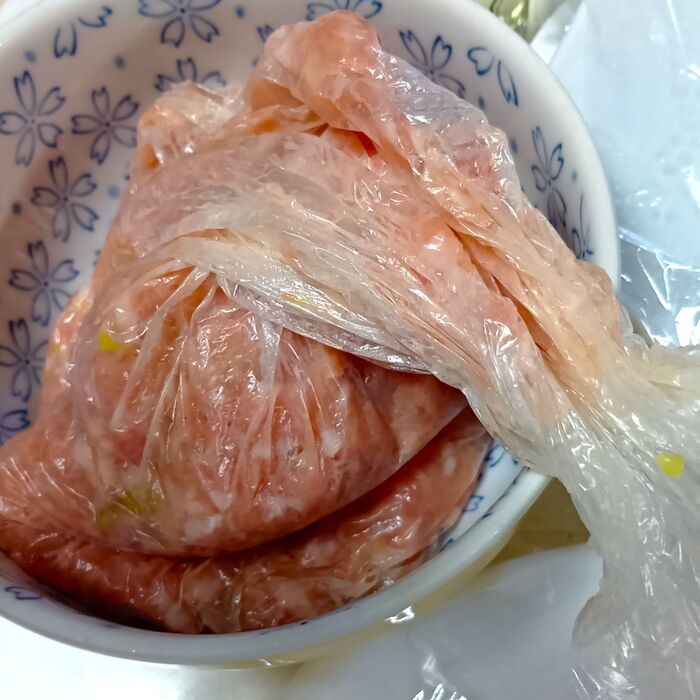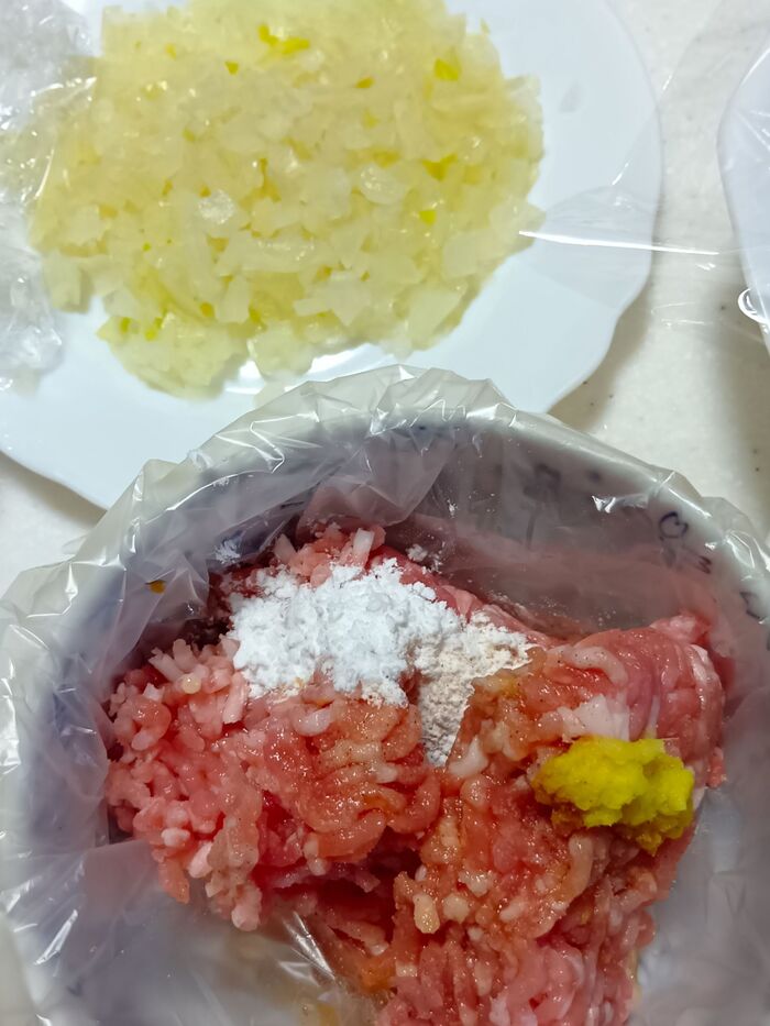 ②ポリ袋(アイラップ推奨)に@の材料と①の玉ねぎを入れ、袋の上からもみ込むようにしてよく混ぜ合わせる。
