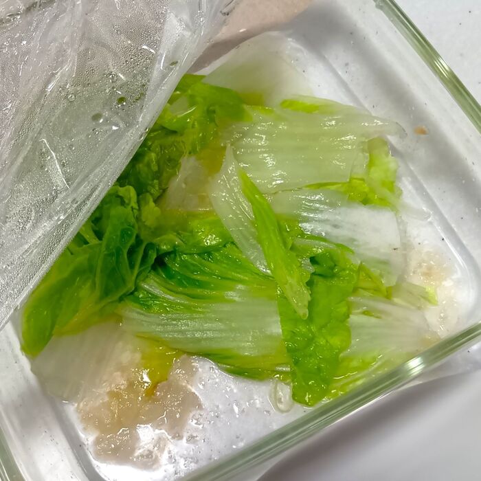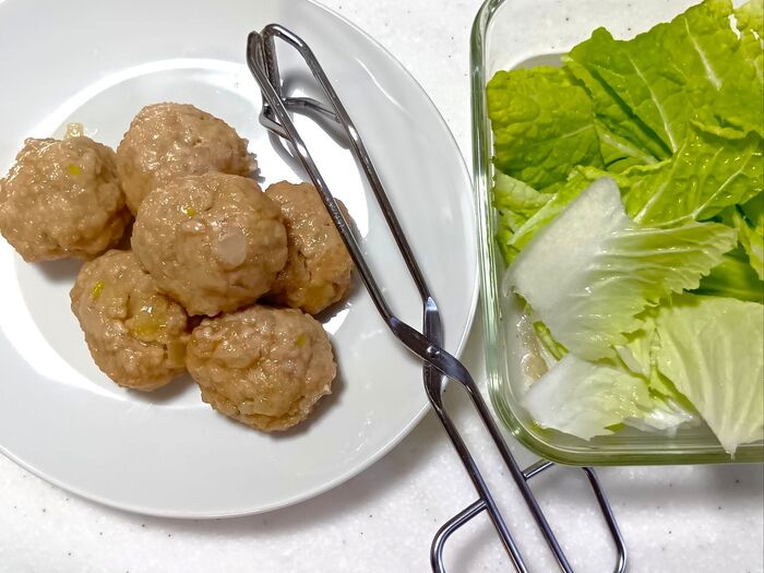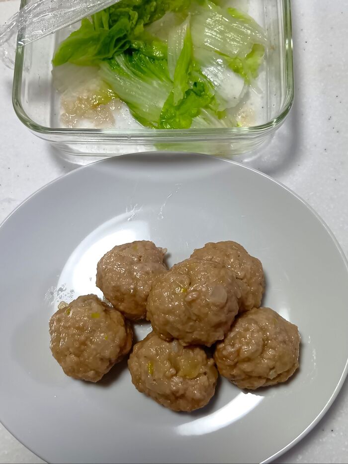 ⑤加熱した肉だねを耐熱皿から取り出して別皿に移す。空になった耐熱皿に白菜の葉を交互に重ねながら敷き詰める。電子レンジ(600W)で2分加熱し、上下を返してさらに30秒加熱する。