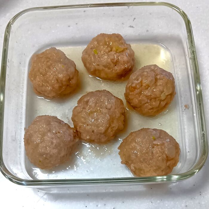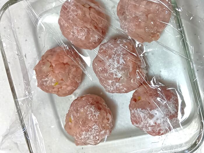 ③別皿に片栗粉を用意する。手にサラダ油を薄く塗り、②の肉だねを1個50gずつ、計6個に丸める。丸めた肉だね全体に片栗粉をまぶし、耐熱皿(直径18cm×高さ5cm程度)に間隔をあけて並べる。