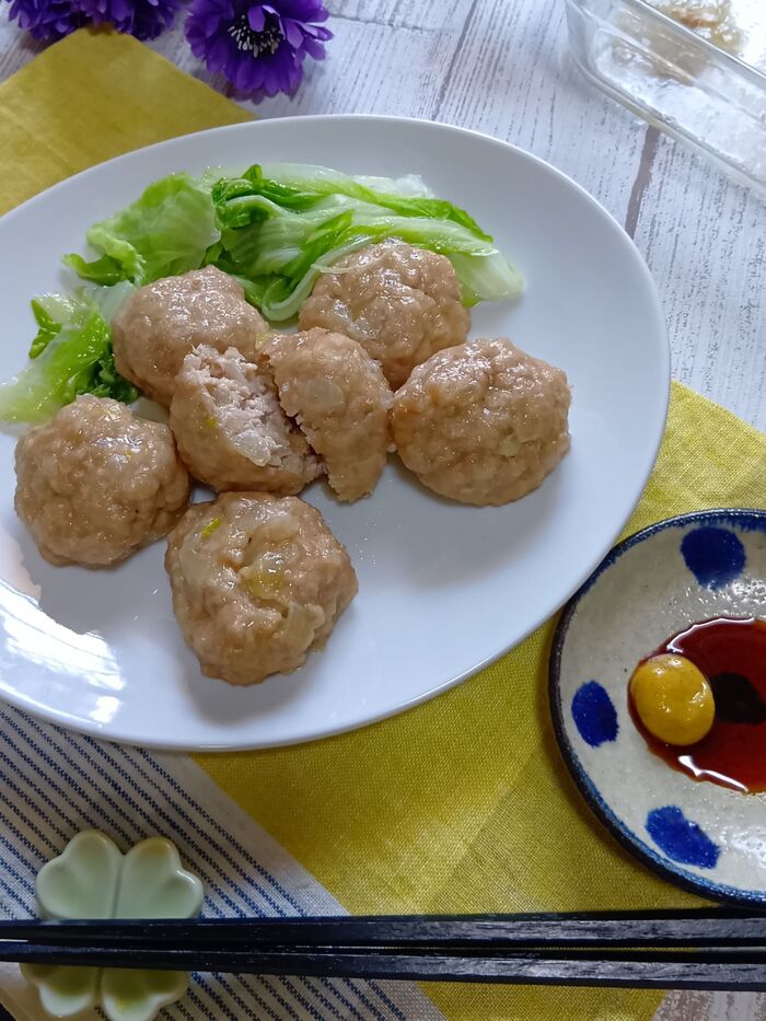 ・肉だね全体に片栗粉をまぶしてから電子レンジ加熱することで、完成したシュウマイの表面がパサつかず、しっとりと仕上がります。