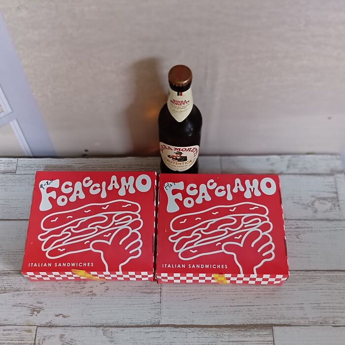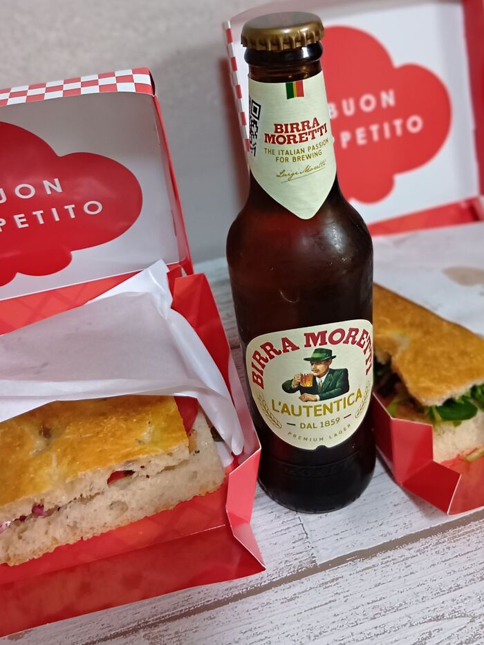 フォカッチャの看板メニューは自家製の豚バラ肉にチーズ、タマネギなどの具材を挟む「ポルケッタ」だそうですが、今回は、トリュフとサーモンのフォカッチャ、そしてイタリア産のビールをテイクアウトすることにしました!