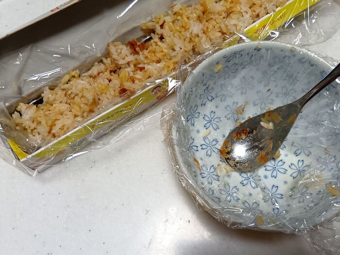 スプーンで押さえながら、ラップの空き箱の中で均一になるように広げておきましょう。