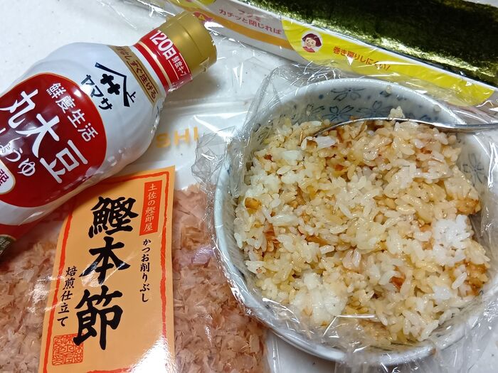 温かいご飯に、かつおぶしと醤油を加えてよく混ぜ、③の海苔の上にすべてのせる。