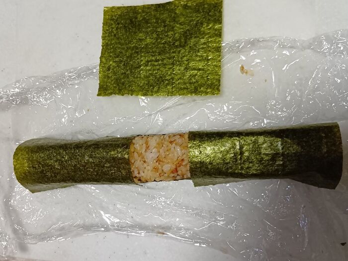 ⑦再び広げていたラップをしてしばらく置き、海苔をしめらせておく。