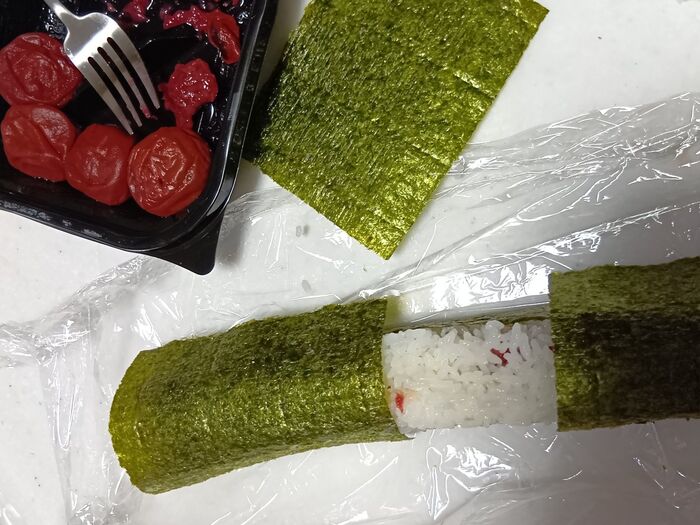 ⑧ 梅干しのおにぎりも同じ手順で作りますが、少し違うのは、海苔を3枚敷いてから、ご飯を半分ラップの空き箱に入れて広げ、その上に梅干しをのせ、最後に残りのご飯をのせることです。
