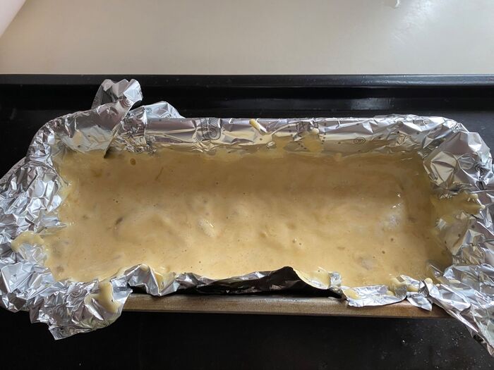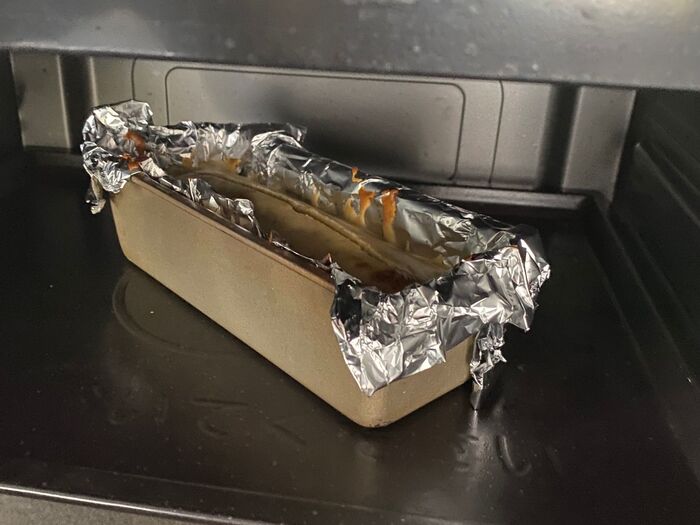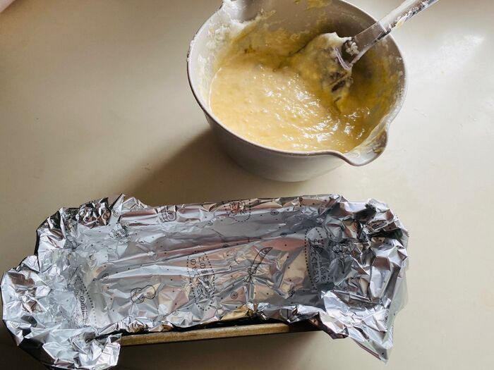 ⑤パウンド型にくっつかないアルミシートを敷きます。