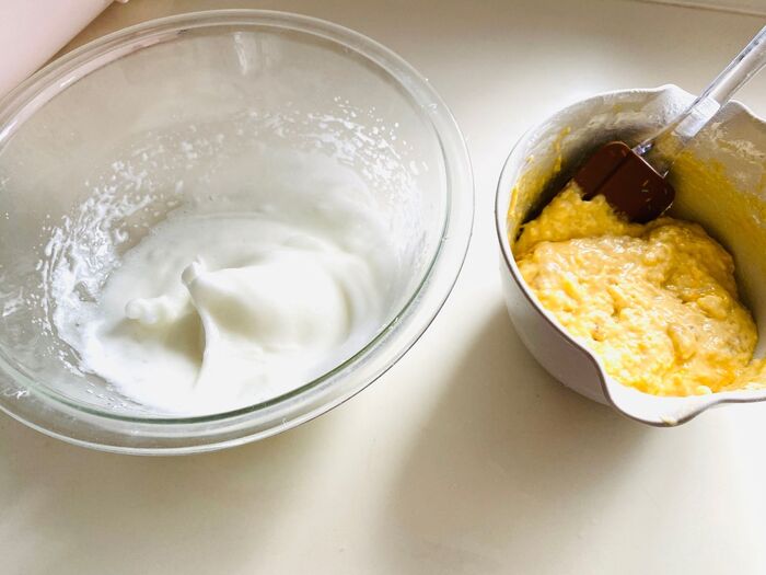 ③よく混ぜた卵黄に、砂糖と溶かしバターを入れ混ぜます。