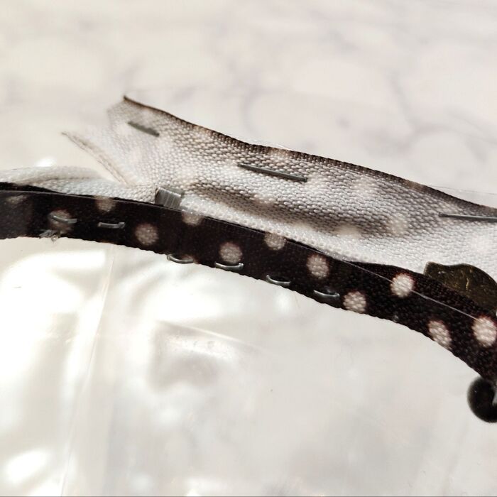 切り口に、図のようにファスナーのおもて面を重ね、ホチキスで等間隔にとめていく。