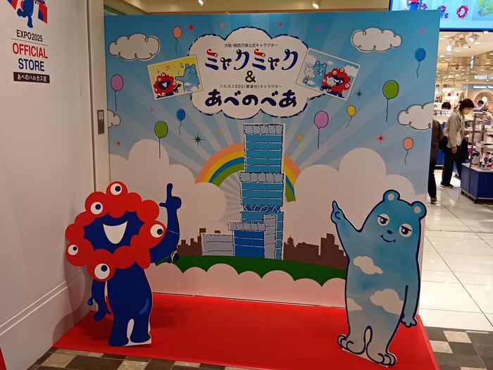 あべのハルカス近鉄本店には「2025大阪・関西万博オフィシャルストア」があり、万博公式キャラクター「ミャクミャク」のグッズや限定商品が販売されていますよ。