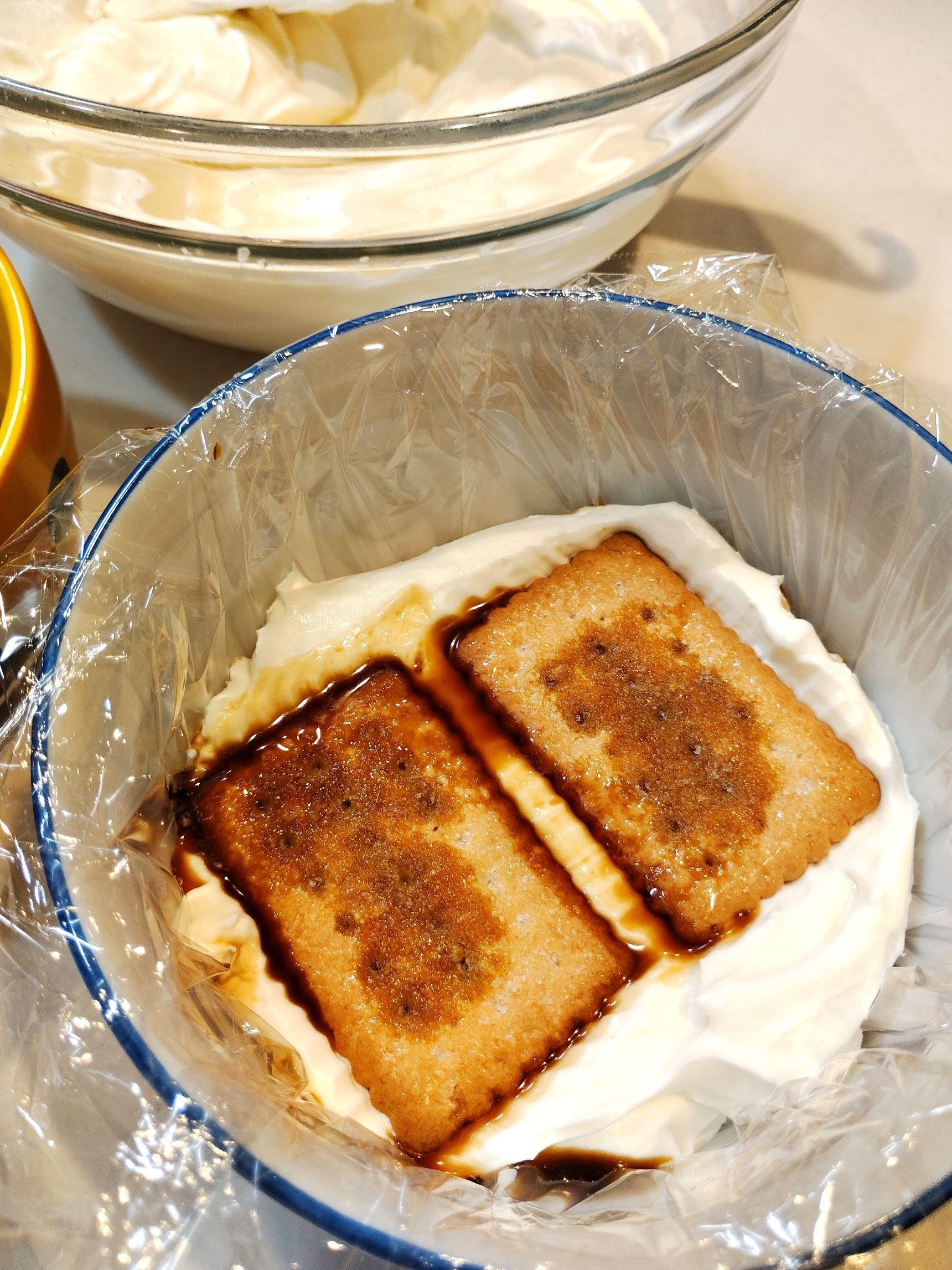 ボウルにティラミスクリームを入れて、ビスケットを平らに入れる→コーヒー液をかける→クリーム→ビスケット→コーヒー液→クリーム を繰り返し、冷蔵庫で冷やす。(1時間以上)