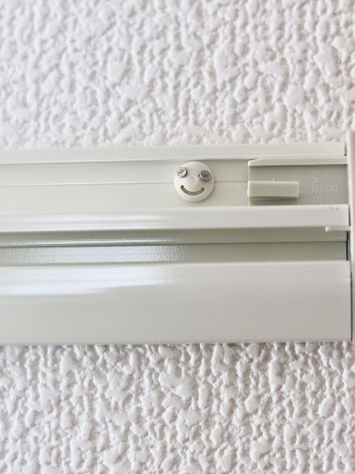 かなりしっかりした作りですが、取りつけは簡単。石膏ボードなら、このニコちゃんマークの目の部分に細ピンを刺すだけ。しっかり付いているのでグラつきもありません。なのに小さな穴しか開かないので、賃貸でも使えます。