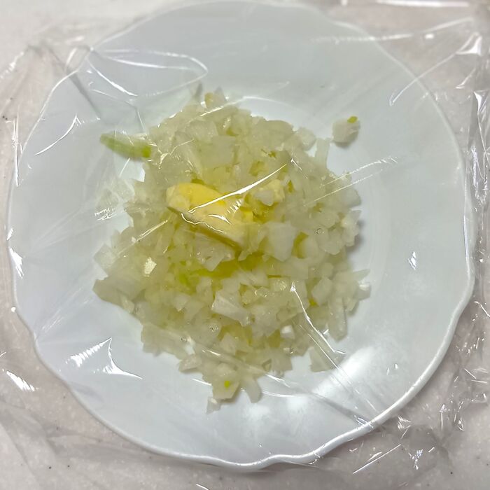 ①玉ねぎをみじん切りにして、耐熱皿(直径18cm以上)に平らに並べます。中央にバターを置き、ラップをしてから電子レンジで600Wで1分30秒加熱します。加熱後、ラップを外して混ぜてから、10分程度冷ます。