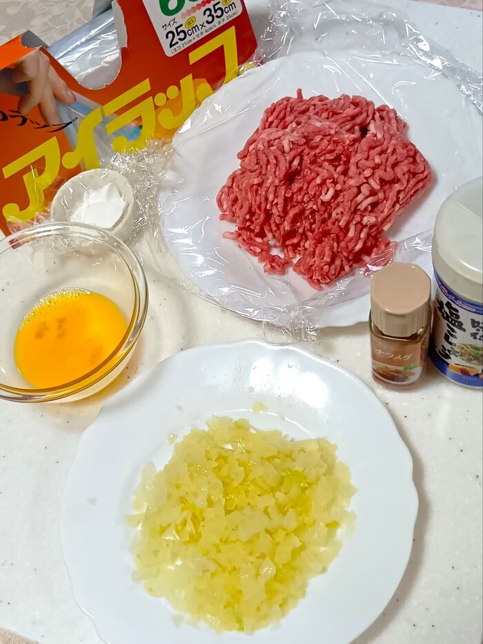 ②ポリ袋に①、合挽肉、A 卵1/2個(25g)、塩・胡椒・ナツメグ少々、片栗粉小さじ1を入れてもんで良く混ぜる。