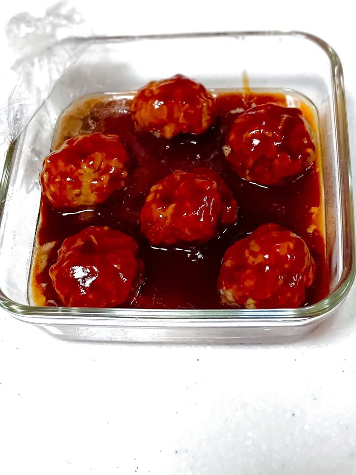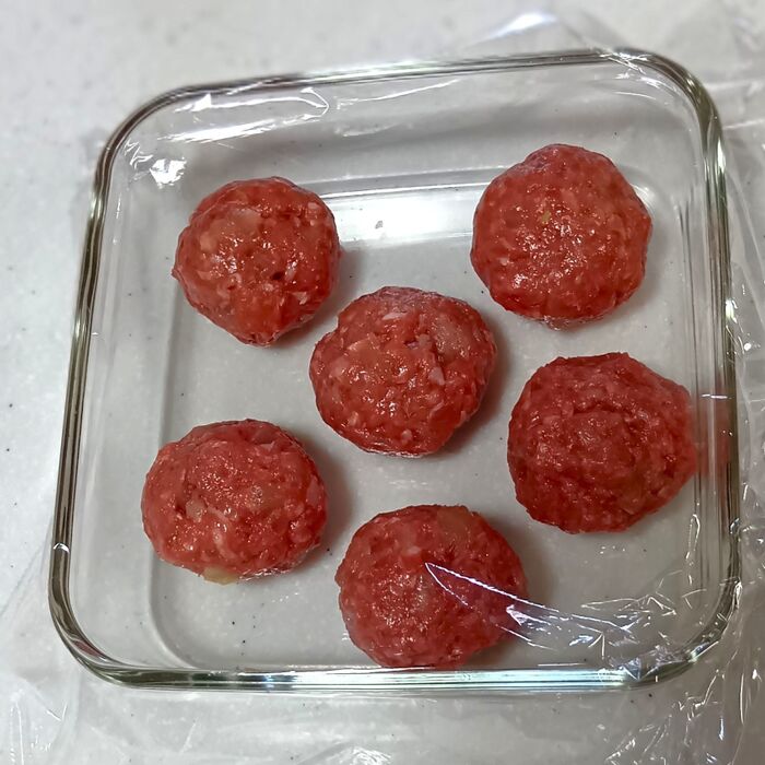 ③手に薄く油(分量外)を塗り、②の肉だねを50gずつ丸め、耐熱ガラスの容器に、1つずつ間隔をあけて並べる。