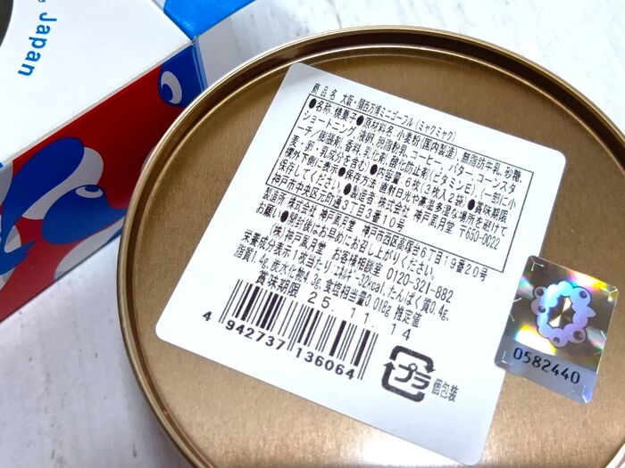 缶の裏はこのような感じです。神戸風月堂のゴーフル入りで、中身も美味しいんです!