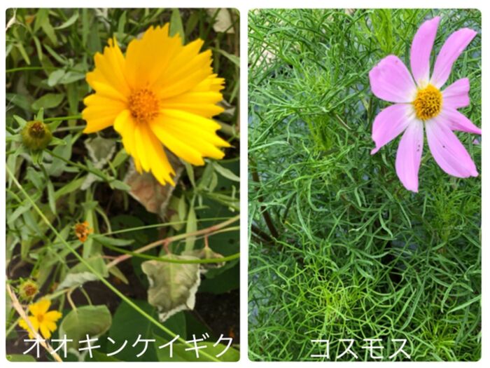 コスモスと比べると花の形はどことなくにていますが、葉の形が違います。