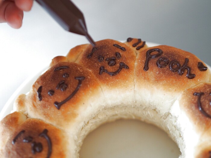 7.チョコペンを湯煎にかけ、パンにプーさんの顔を描いたら完成です!
