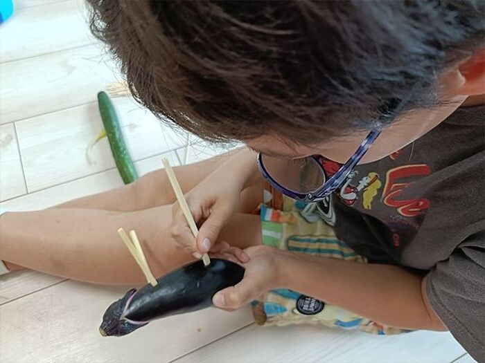 ナスも同様に、四隅に割り箸や竹串を差し込んで足を作ります。