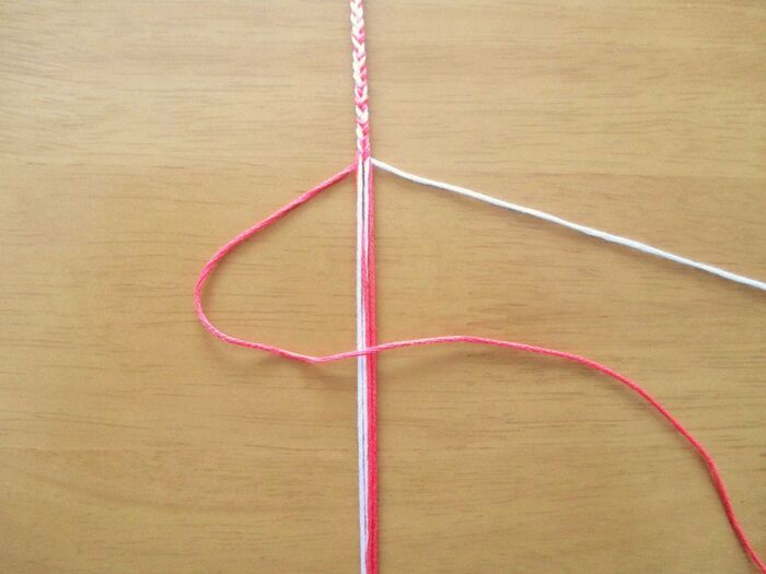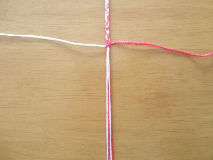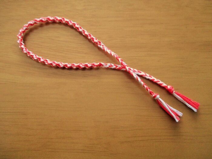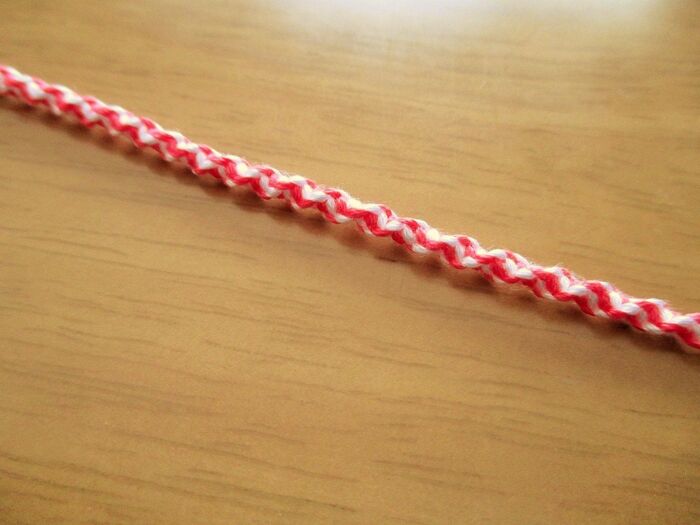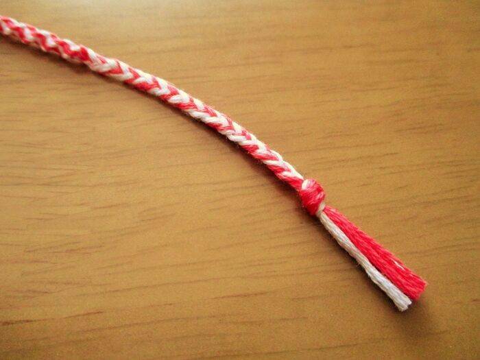 ねじり模様が編めたら、三つ編みを5cmします。その後、ひと結びしてから両端を1cm位残し切ります。