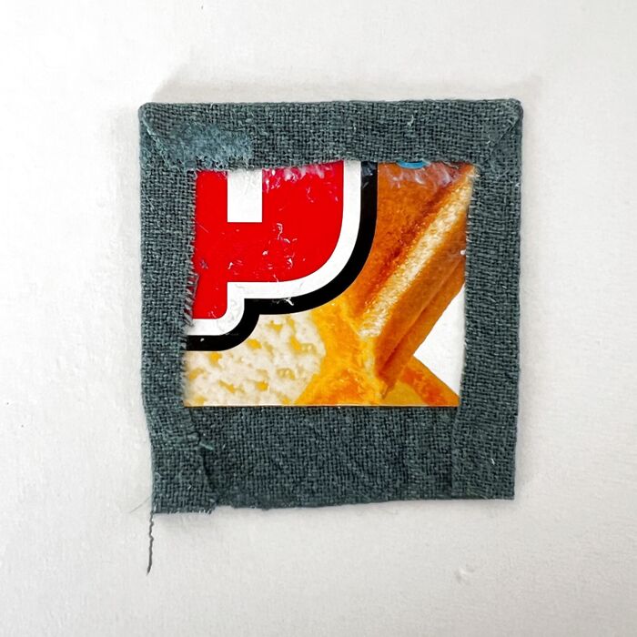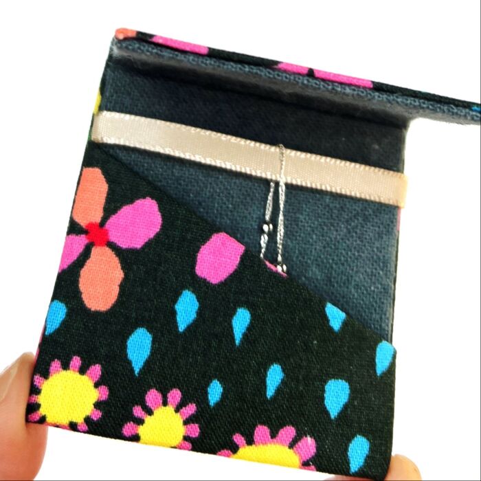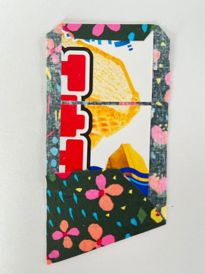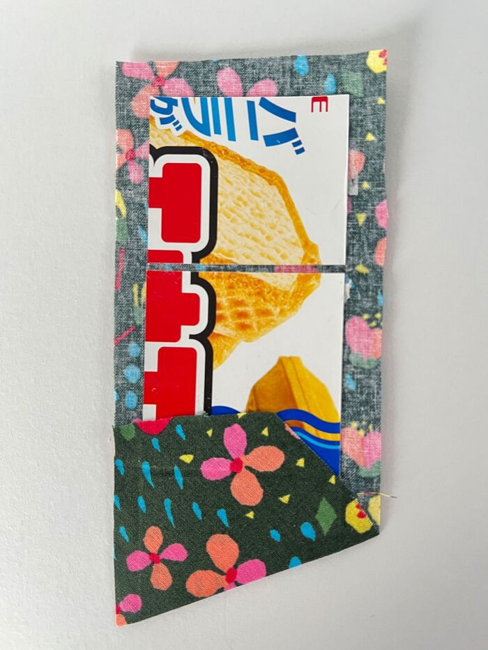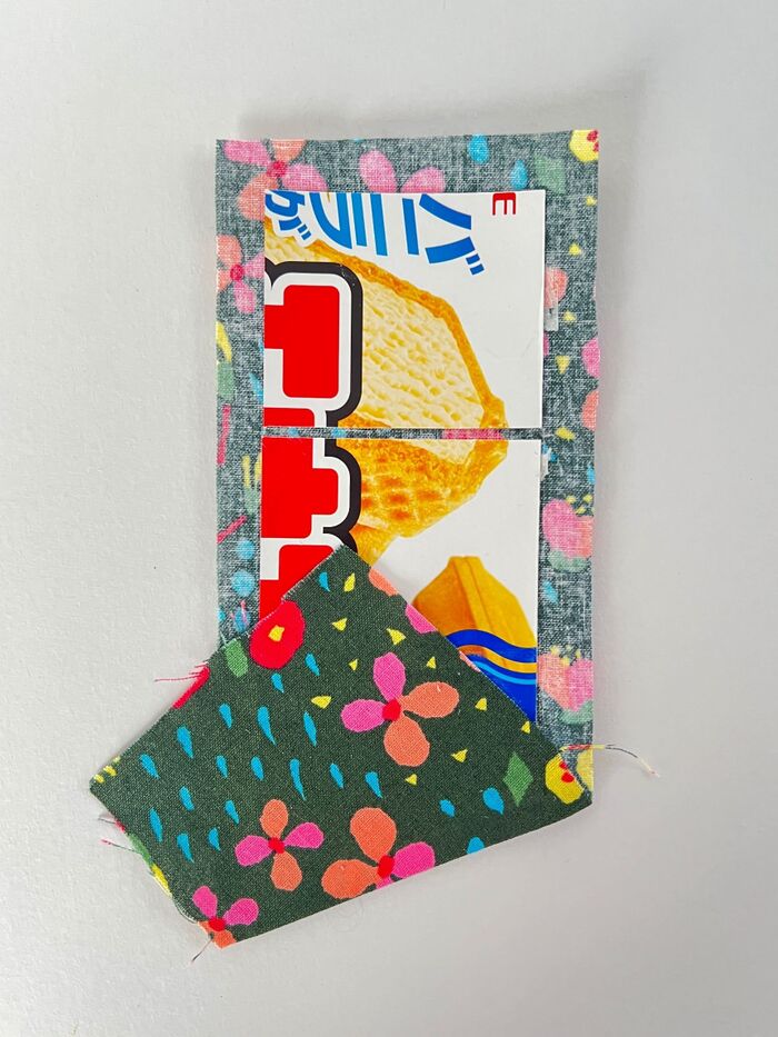 上の布は角を斜めにカットし、厚紙に貼り付けます。